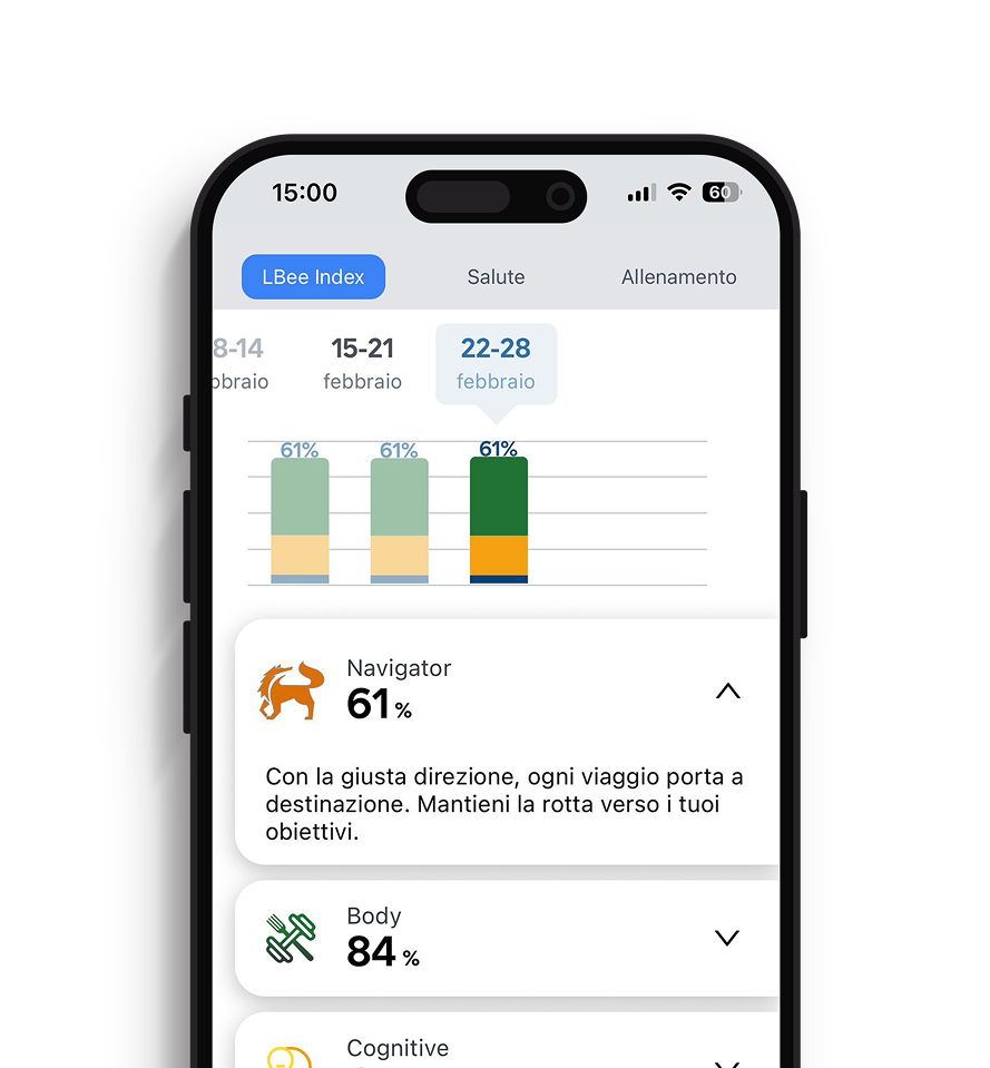 Puoi monitorare i tuoi progressi tramite l’LBEE Index, l’indice che misura la tua aderenza al percorso e l’evoluzione delle tue routine nel tempo.